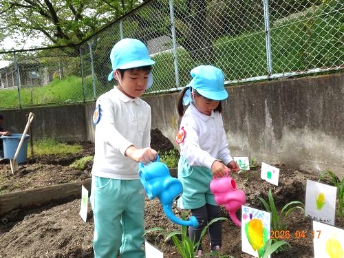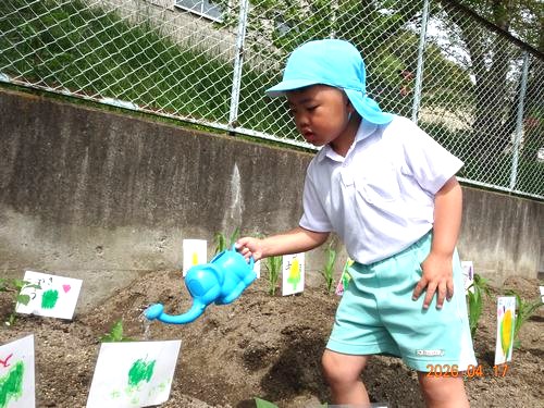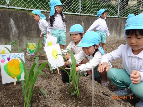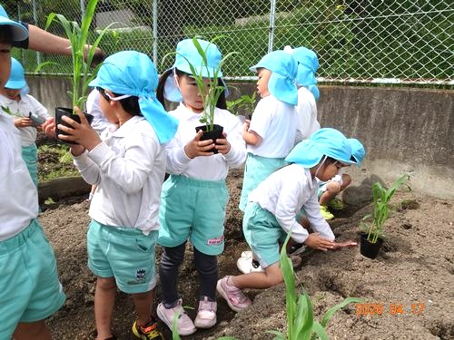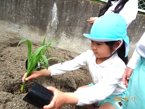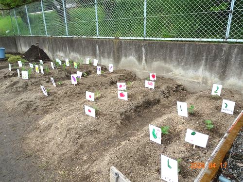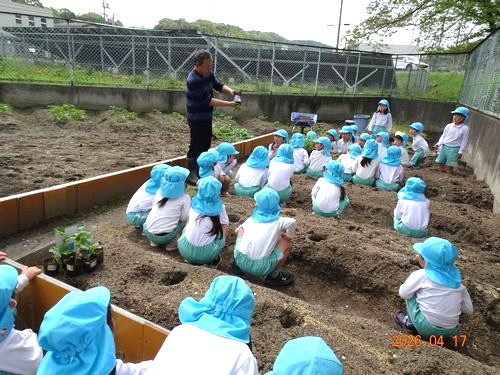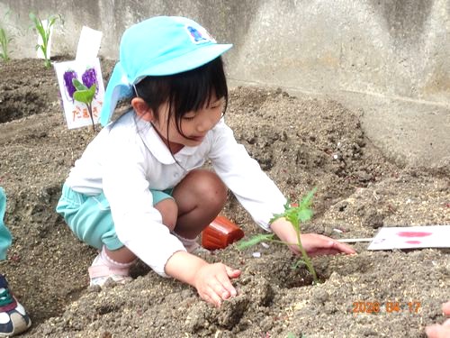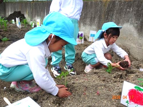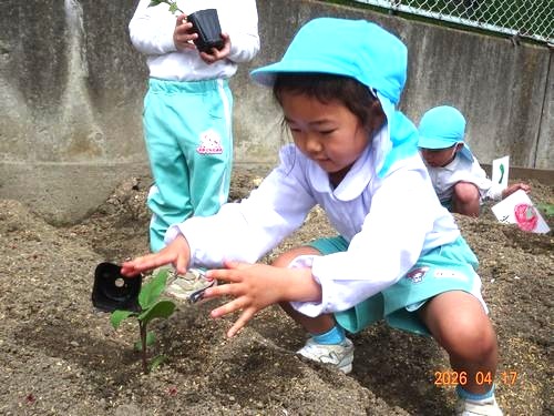 昨日(4/17)、うめ組(5歳児)の園児たちが、園の菜園で夏野菜の苗を植えました。