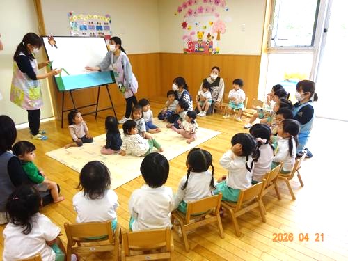 誕生児は、みんなの前に座ってお祝いしてもらい、うれしそうでした。そして、みんなからはお歌のプレゼントをしてもらいました! また、お楽しみコーナーでは先生が「いっぽんばし にほんばし」のパネルシアターを披露してくれました。音楽を口ずさんだりパチパチ手を叩いたりしながら楽しむことができました。