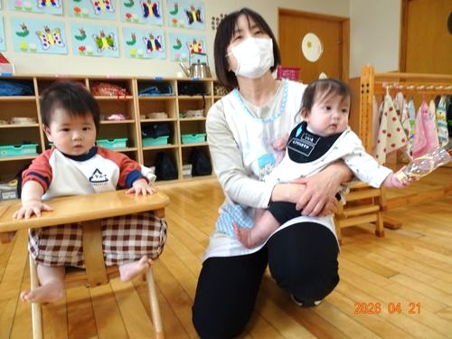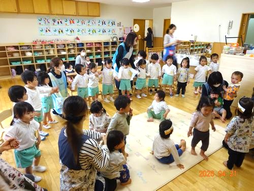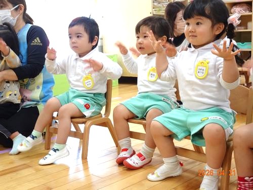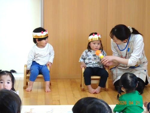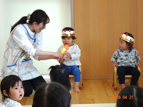 昨日(4/21)に、こども園のひまわり組(2歳児)の保育室で、4月生まれのお友だちをお祝いする誕生会を行いました。