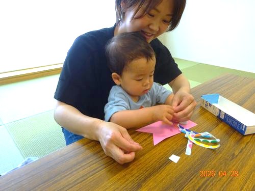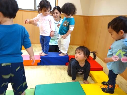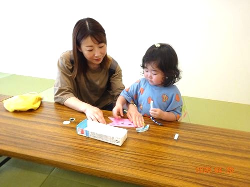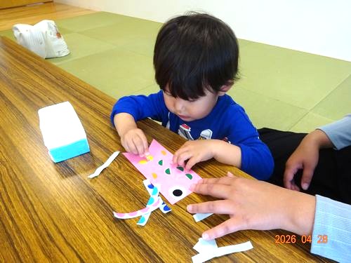 今回は、乳児保育園に集合し、在園児と一緒にこいくぐりや運動遊びをしたり、園庭で遊んだりして楽しみました。その後、こども園に移動し、こいのぼりの製作をしました。目や体にシールを貼って、素敵なこいのぼりを完成させることができました。また、こども園の園庭でもおままごとや遊具などで遊びました。